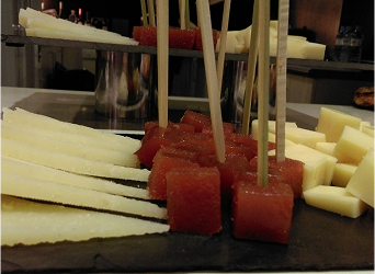Dados de queso semicurado con uva y fruta fresca. Una brocheta sencilla y sabrosa con toques dulces y salados. Perfecta para aperitivos ligeros y saludables. Se adapta a todo tipo de eventos.