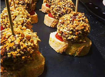 Base de pan rústico con mousse suave y topping de sobrasada artesana. El equilibrio ideal entre textura cremosa y sabor intenso. Para quienes buscan un bocado contundente y sabroso. Aporta color y contraste.